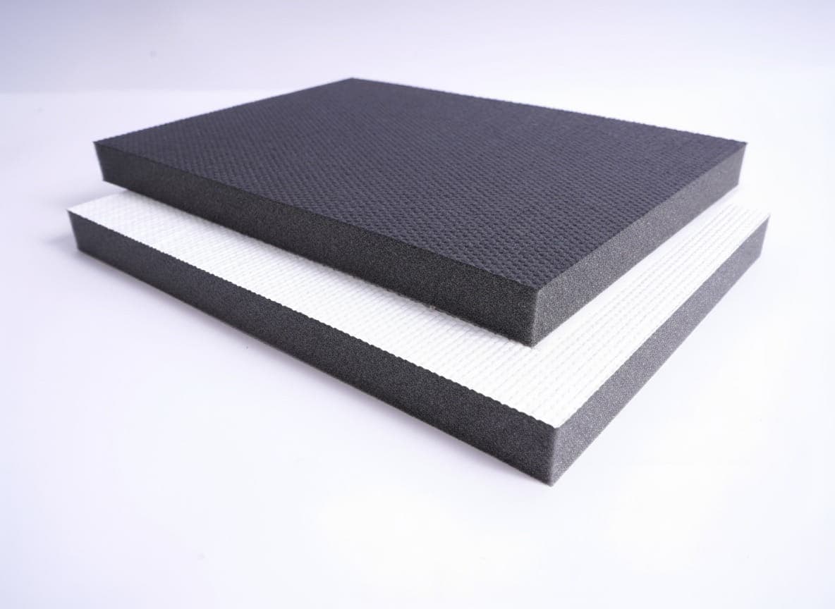 De EASYfoam Acusticab brengt akoestiek en esthetiek samen. Het opencellige polyetherschuim is afgewerkt met een zwarte of witte PU-film die vocht tegenhoudt zonder de geluidsabsorberende werking te beïnvloeden. Dankzij de speciale toplaag is het materiaal bestand tegen spatwater, olie, benzine, koolwaterstoffen en oplosmiddelen. Dankzij de specifieke wafelstructuur heeft het schuim een luxere uitstraling dan EASYfoam PU en is het minder gevoelig voor plooivorming bij toepassing op gebogen oppervlakken. Het brandvertragende polyurethaanschuim wordt in Europa geproduceerd en draagt zo bij aan een lagere milieubelasting.